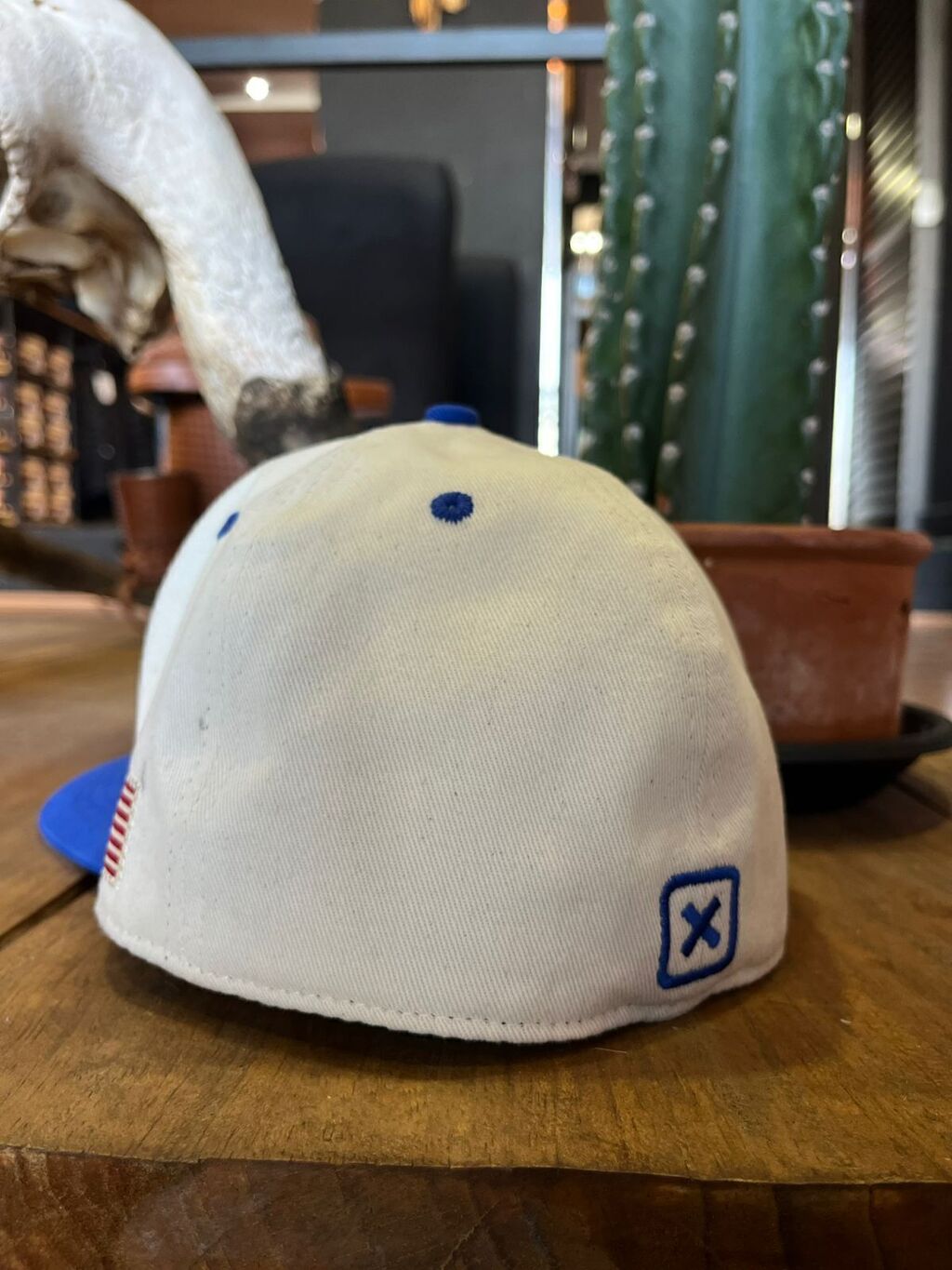 EM ALTO RELEVO NA COR LARANJA E DETALHES AZUL, ABA NA COR AZUL, FECHADO NA PARTE DE TRÁS NA COR OFF WHITE. SEM REGULAGEM.