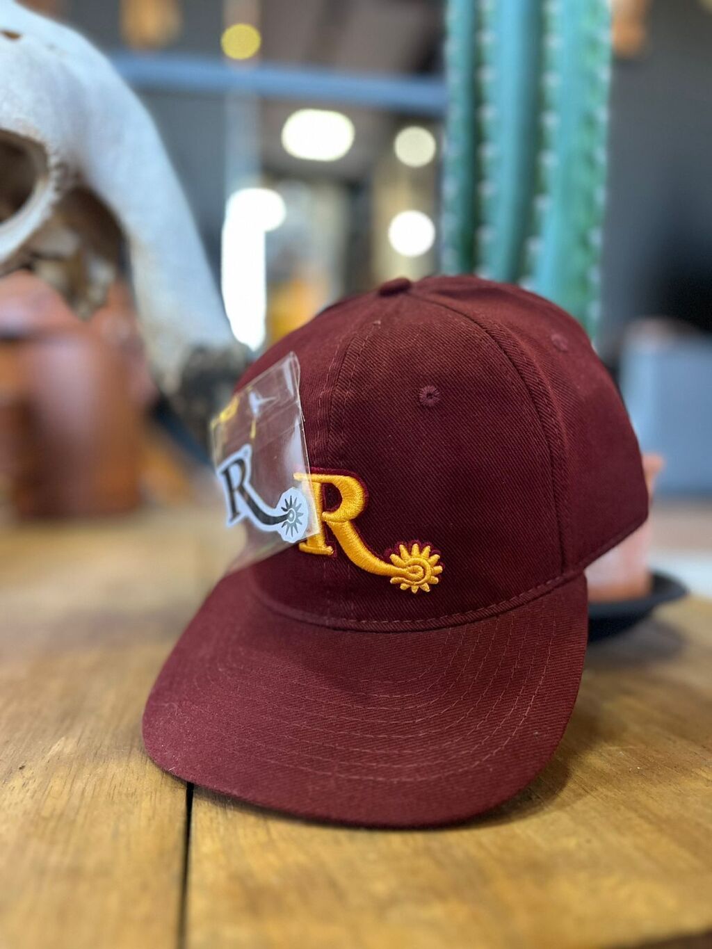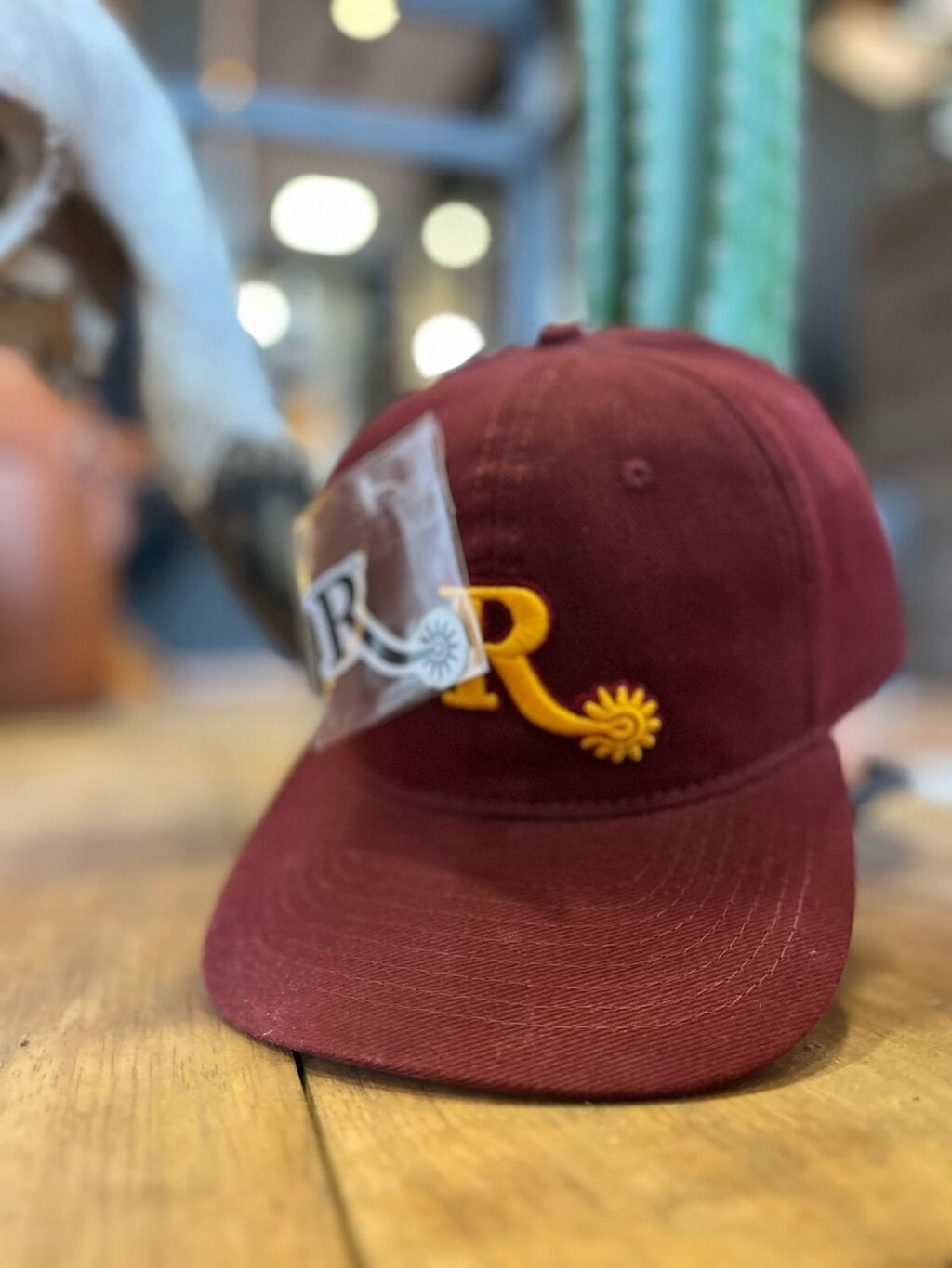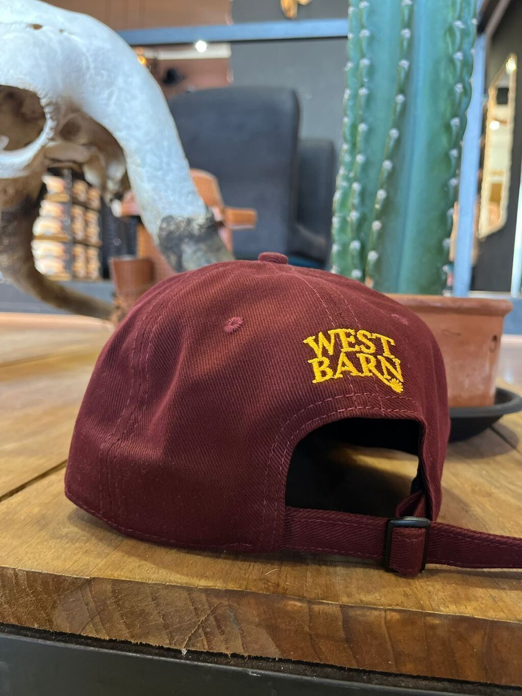 BONE WEST BARN FABRICADO EM TECIDO 100% ALGODÃO DE ALTISSIMA QUALIDADE , AJUSTAVEL NA COR VINHO COM DETALHES EM AMARELO