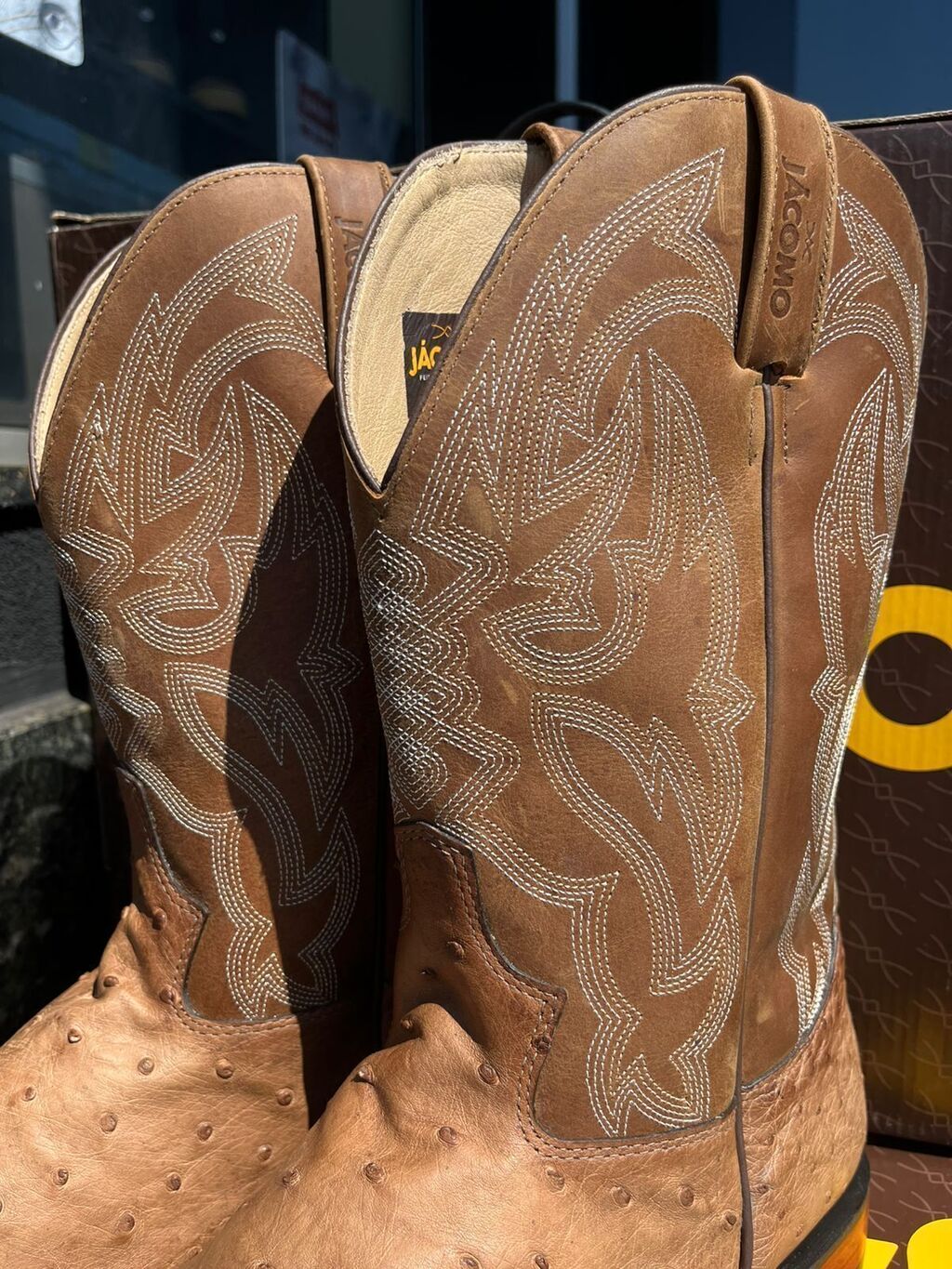 BOTA MASCULINA FABRICADA EM COURO DE AVESTRUZ DE ALTISSIMA QUALIDADE , NA COR TABACO