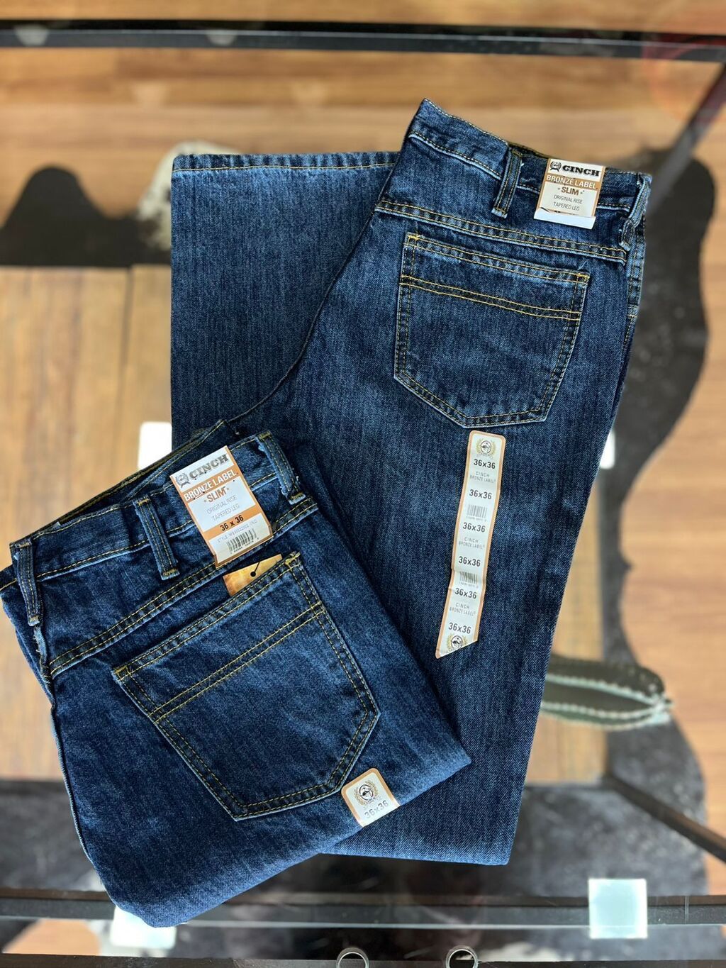Calça Cinch® importada masculina modelo Bronze Label Slim Fit, fabricada em tecido Jeans 100% Algodão de alta qualidade, cintura levemente ajustada , coxa ajustada e fino acabamento.