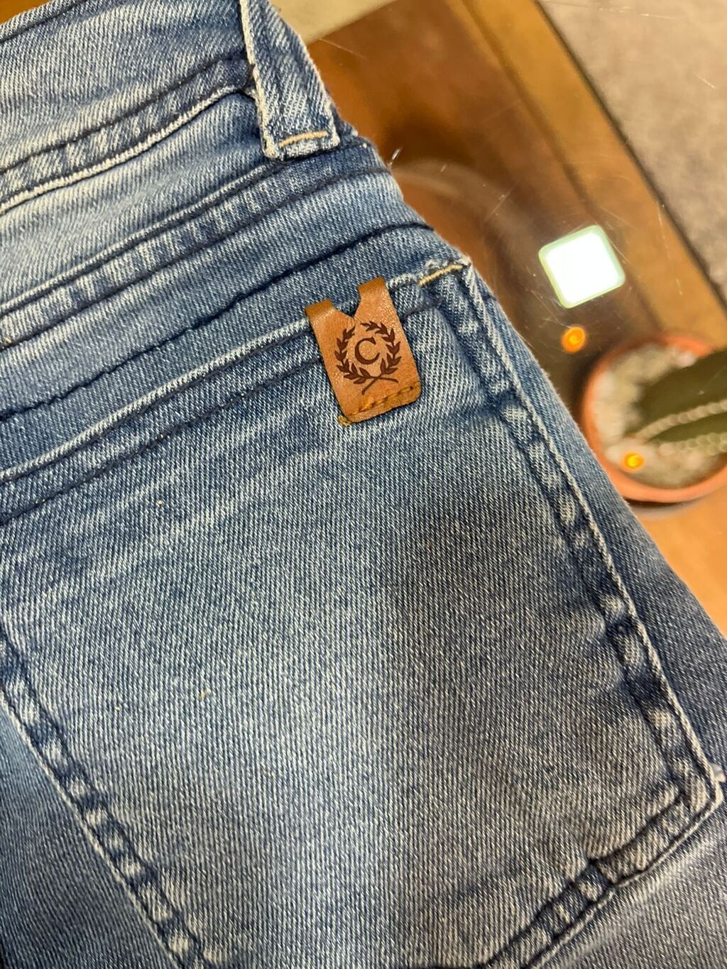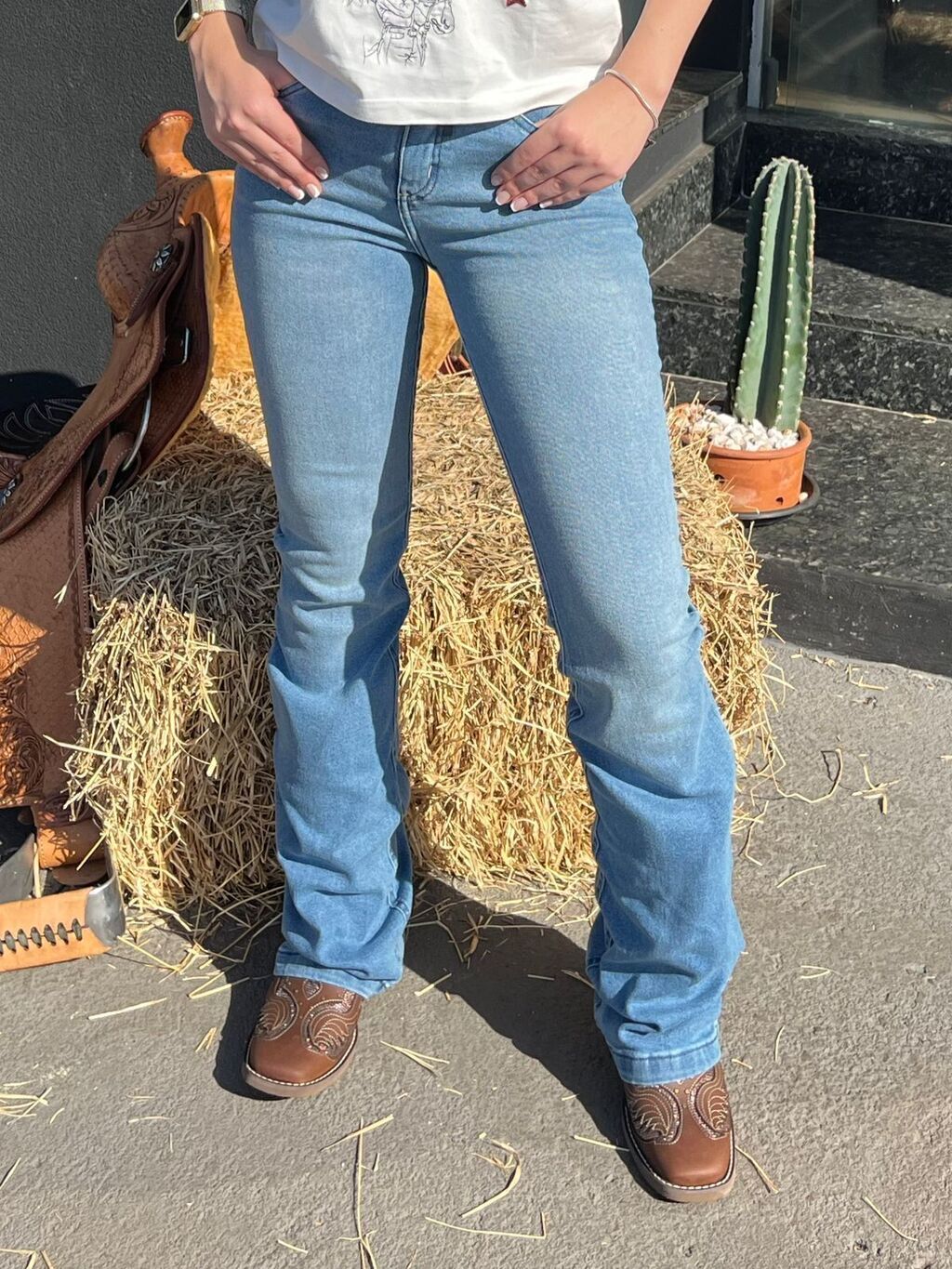 NA JEANS CLARO, CONTEM DOI BOLSOS NA PARTE DE TRÁS E NA PARTE DA FRENTE