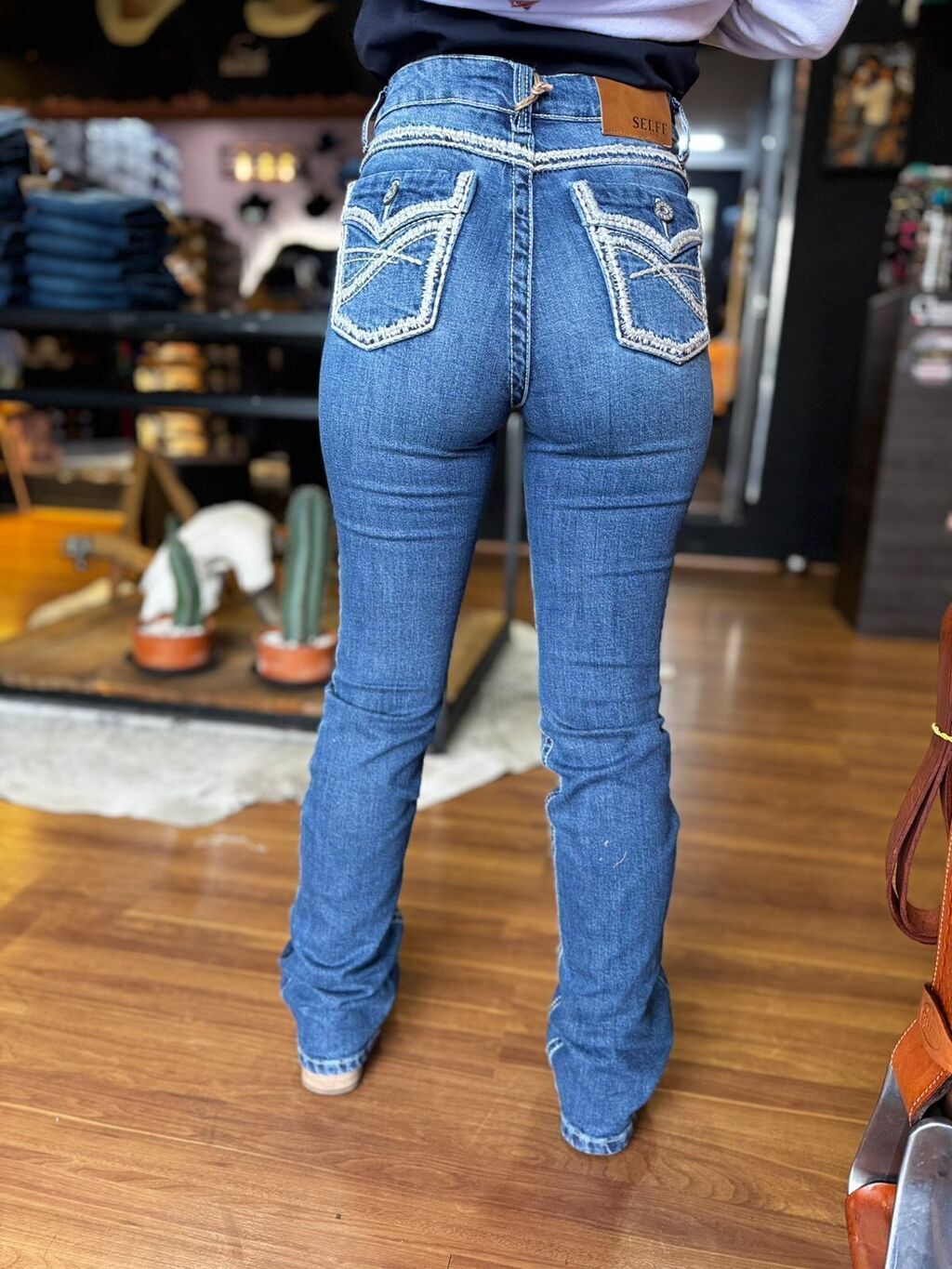 A Calça Jeans Feminina Selff é feita na modelagem Boot Cut e tem a boca levemente mais aberta para se usar com botas. Perfeita para montar, sua principal característica é a cintura no lugar (nem alta, nem baixa). O efeito push-up (levanta o bumbum), juntamente com uso do elastano de alta qualidade, permitem maior conforto no movimento e valorização das formas.