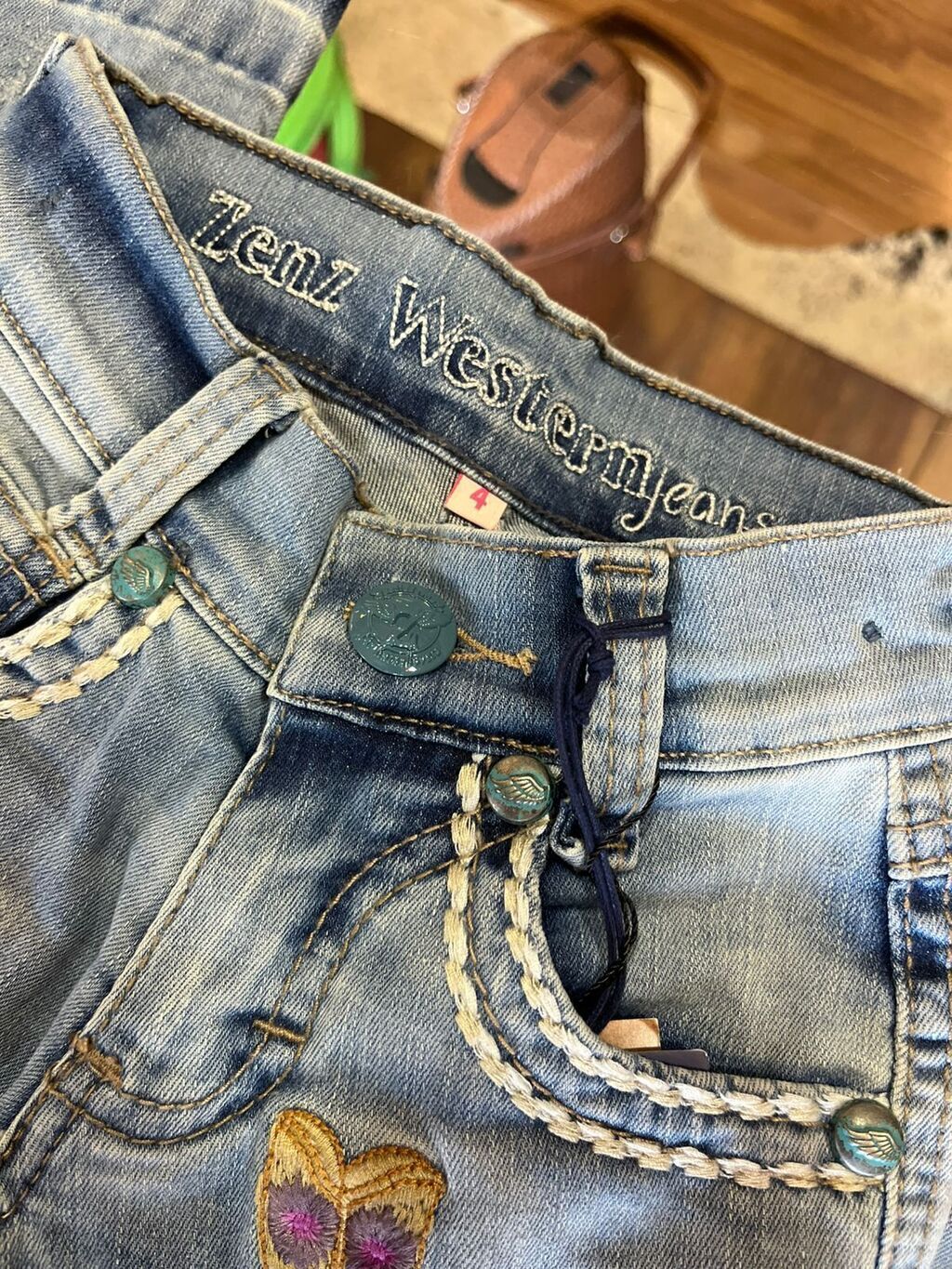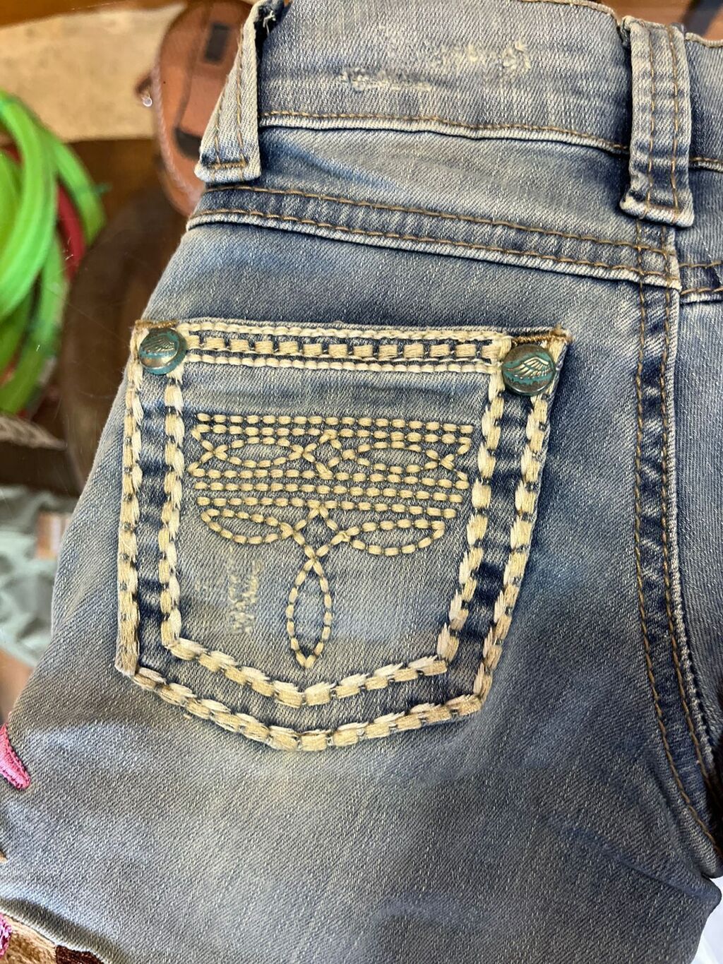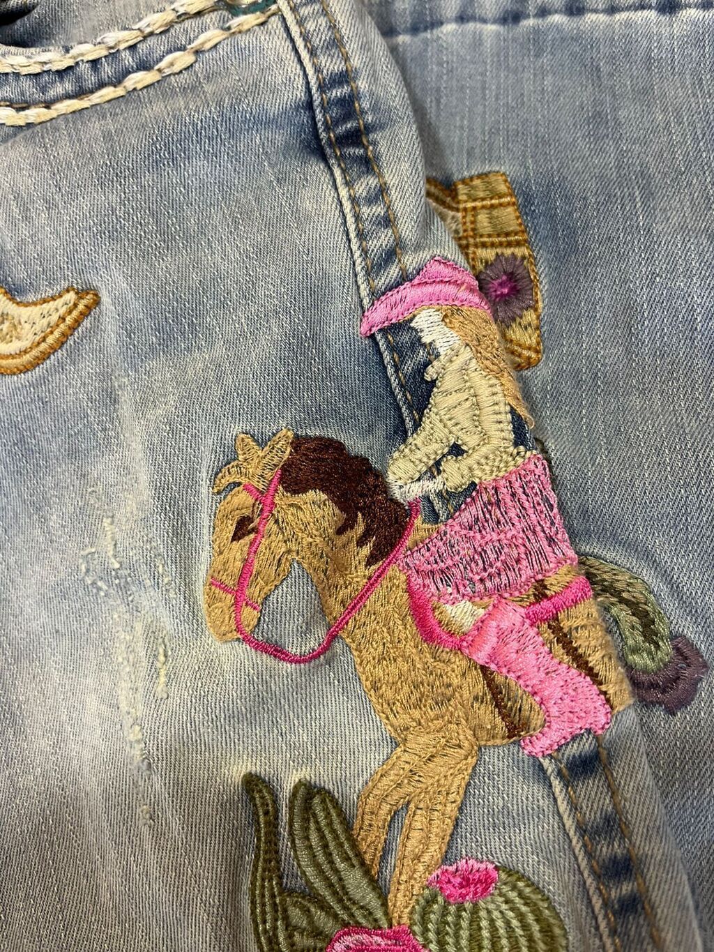 Calca jeans country infantil feminina em jeans com elastano e lavanderia artesanal em tons de azul medio com efeitos de desgaste e puidos leves. Modelagem flare com ajuste de elastico no cos interno. Bordado de elementos western por toda a peca como cacto, bota, chapeu e bordado lateral maior de cowgirl sobre cavalo.