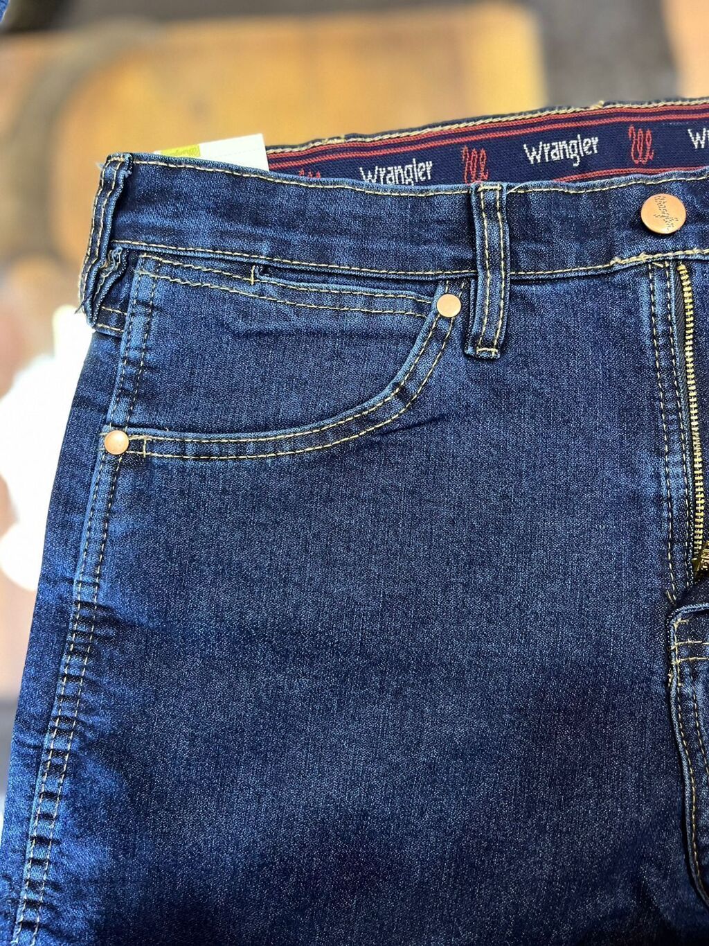 Tem a cintura no lugar, bolsos frontais com boca regular, bolsos traseiros com bordados, costura interna com pesponto de segurança e acabamento em rebites de cobre e botão personalizados.