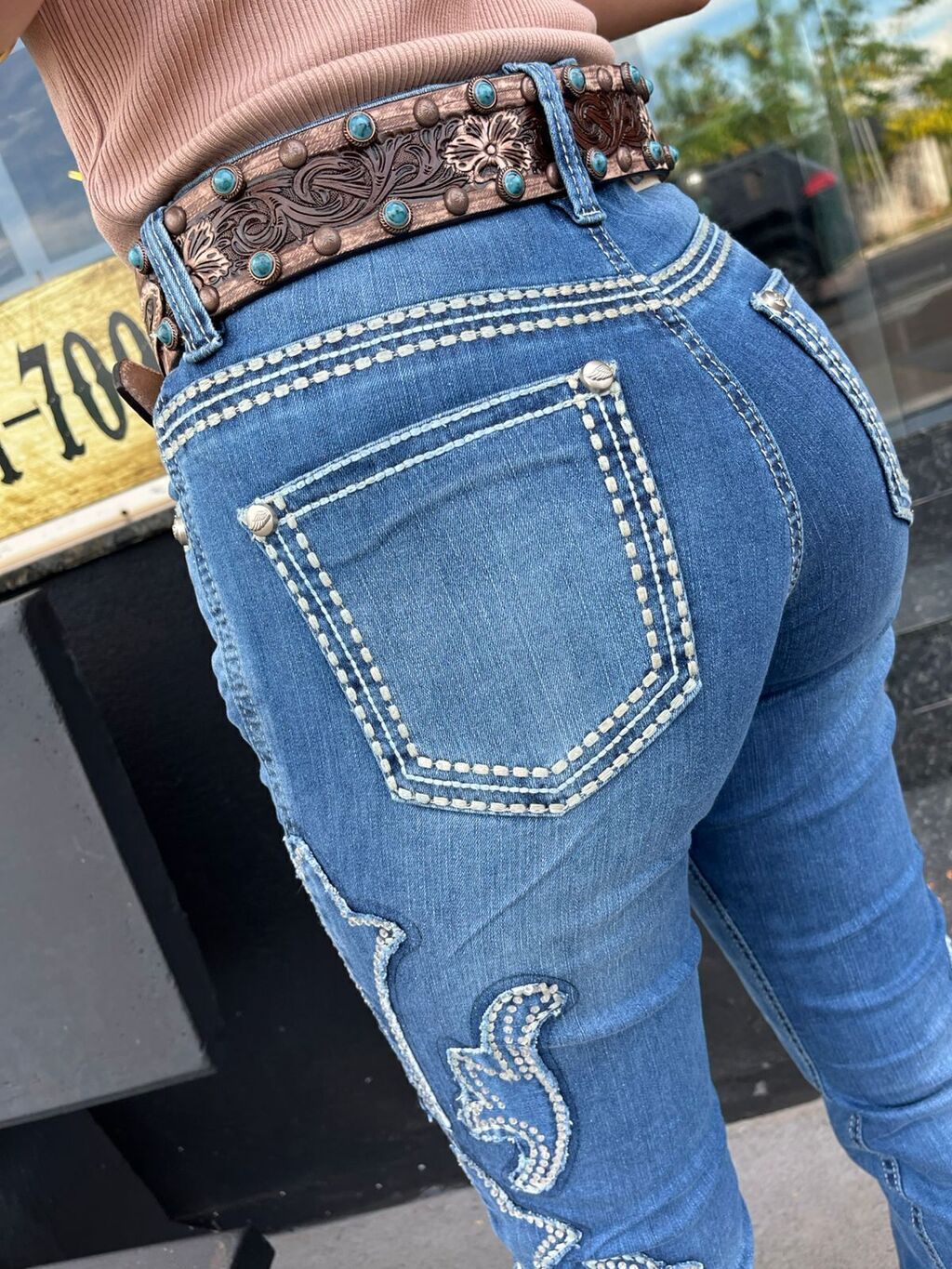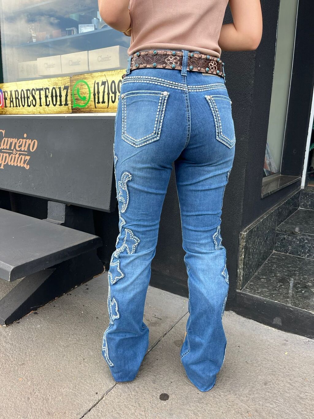 Confeccionada em jeans premium, com lavagem artesanal em azul médio e barra desfeita, é uma peça autêntica e cheia de personalidade. Ideal para rodeios, festas country e também para o dia a dia da cowgirl que busca qualidade e beleza em um só jeans.