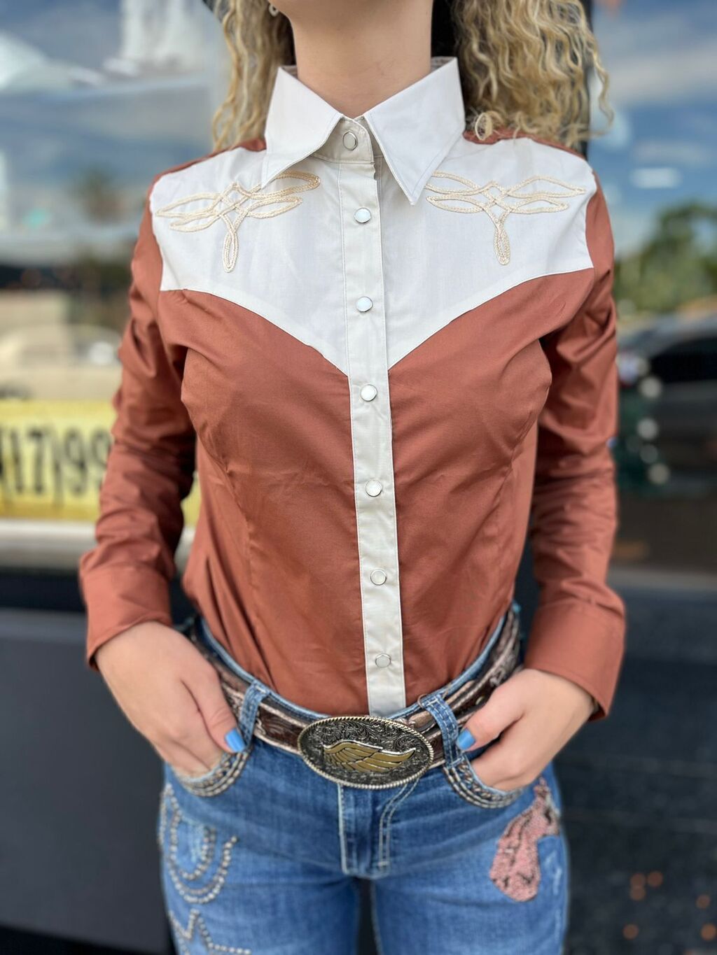 Camisa Feminina Zenz Western Rusty Manga Longa Marrom Com Gola Lapela Bege Com Bordado Bege Ref:ZW0325016-1551.