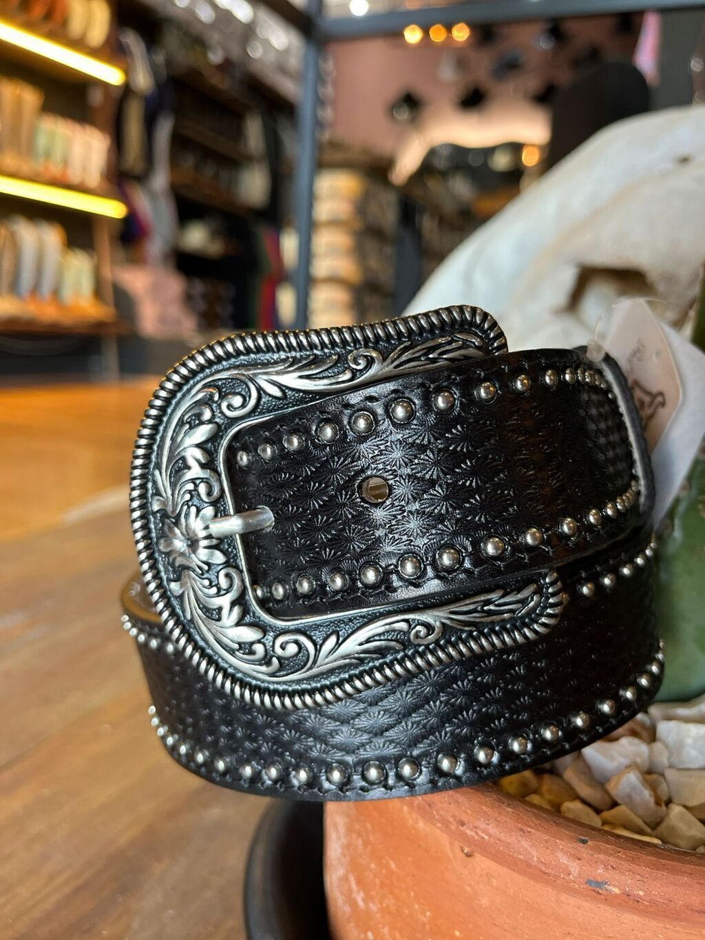 O Cinto Paul Western em Couro com Metal na cor preta é a combinação perfeita entre estilo rústico e sofisticação. Confeccionado em couro legítimo com acabamento texturizado, o modelo conta com rebites metálicos em todo o contorno e aplicações centrais com desenhos geométricos e arabescos, conferindo um visual imponente e único. A fivela trabalhada em metal envelhecido, com detalhes florais em alto-relevo, reforça a autenticidade do estilo western.
