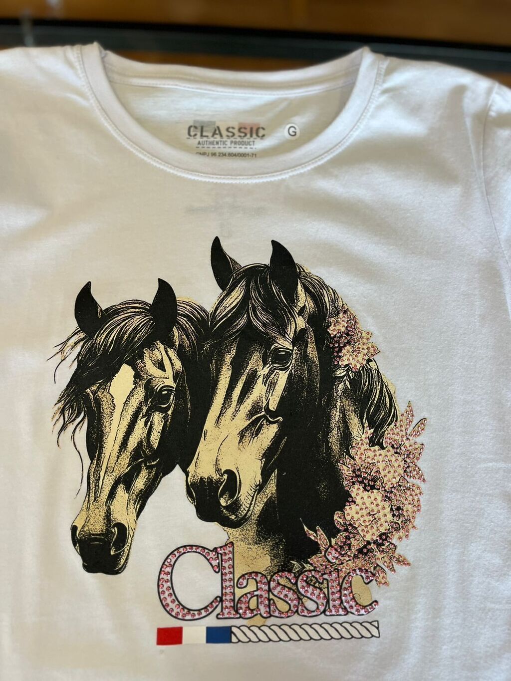 HIRT CLASSIC FABRICADA EM TECIDO 100% ALGOGÃO COM CAIMENTO MAIS SOLTO ESTAMPA COUNTRY COM APLICAÇÕES DE STRASS