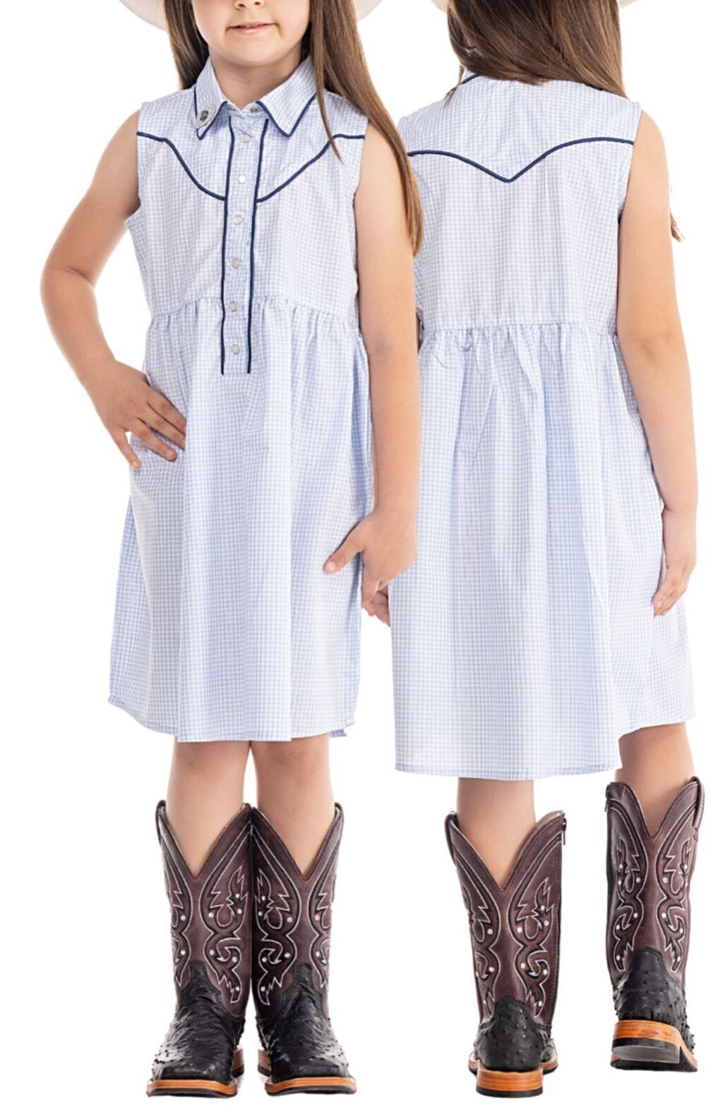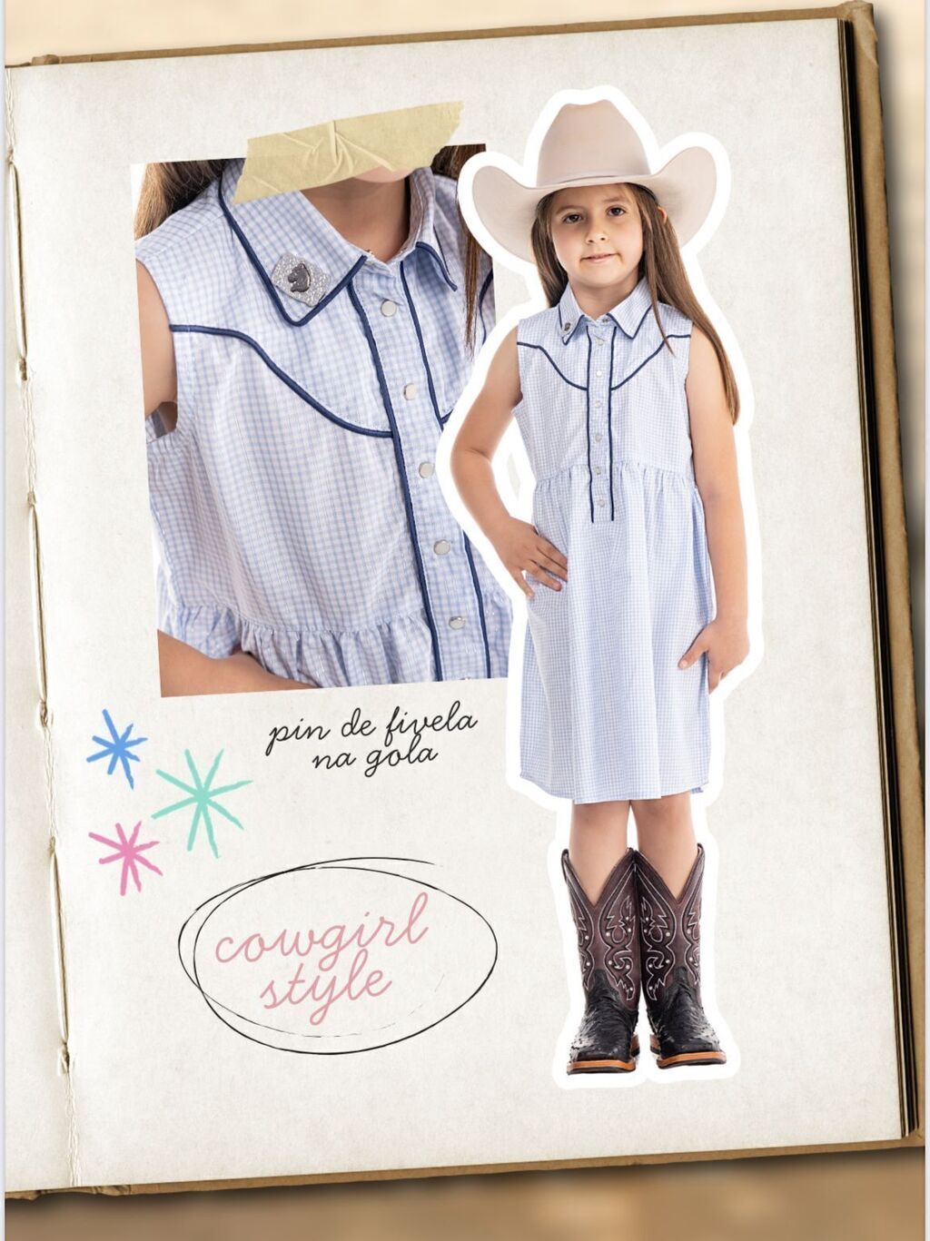 O Vestido Infantil Zenz Western Little Farmer é puro encanto para as pequenas cowgirls! Feito em tecido xadrez azul claro, traz modelagem de camisaria sem mangas e saia rodada, garantindo estilo e conforto para todas as ocasiões.